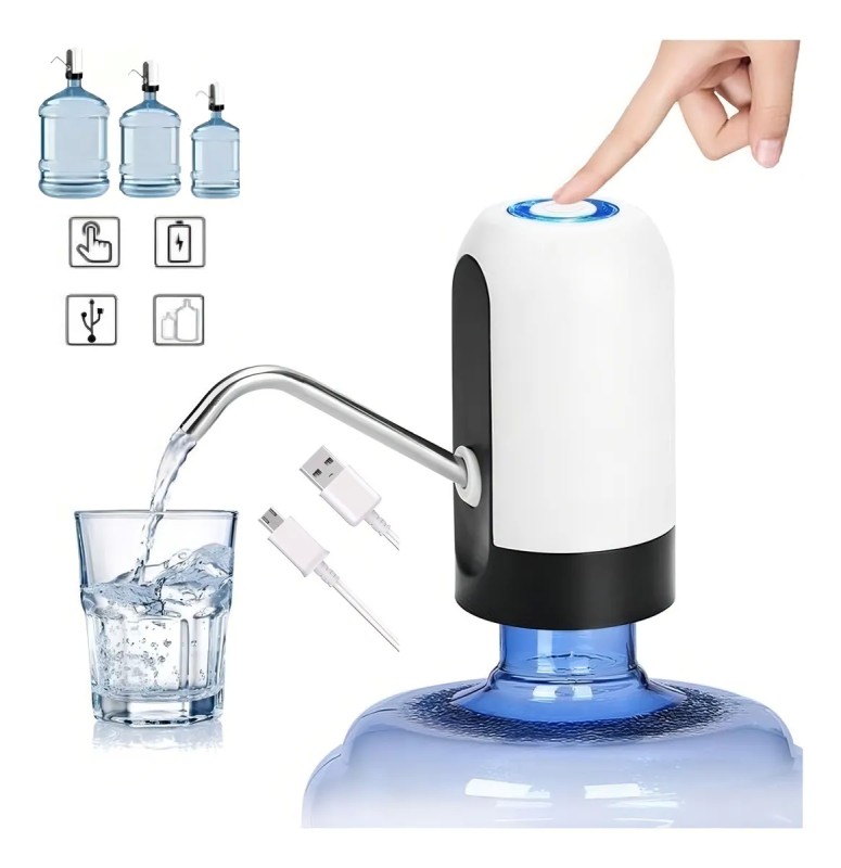 Es un dispositivo diseñado para extraer agua de un bidón de agua mineral o purificada y dispensarla de manera conveniente. Este tipo de dispositivos estan equipados con un conector USB para alimentar su funcionamiento, lo que significa que pueden ser conectados a una fuente de energía como una computadora, un cargador USB o incluso un banco de energía portátil. La utilidad principal de un dispensador de agua USB para bidón es proporcionar una manera fácil y sin complicaciones de dispensar agua de un bidón grande, especialmente en entornos donde no hay acceso a una fuente de agua potable cercana o donde se requiere una solución portátil. Son útiles en oficinas, hogares, campamentos, eventos al aire libre, o cualquier lugar donde se necesite acceso rápido y conveniente a agua potable.