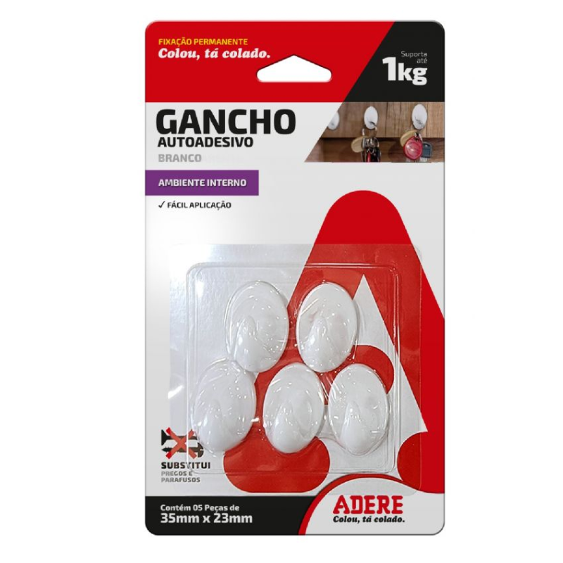 Es un dispositivo diseñado para colgar objetos en superficies sin necesidad de clavos, tornillos u otros aditamentos. Estos ganchos tienen una parte posterior adhesiva que se adhiere a la superficie deseada, como paredes, puertas, azulejos, etc. La parte delantera del gancho tiene una protuberancia o gancho en el que se pueden colgar objetos ligeros, como llaves, toallas, paños de cocina, cuadros pequeños, etc.