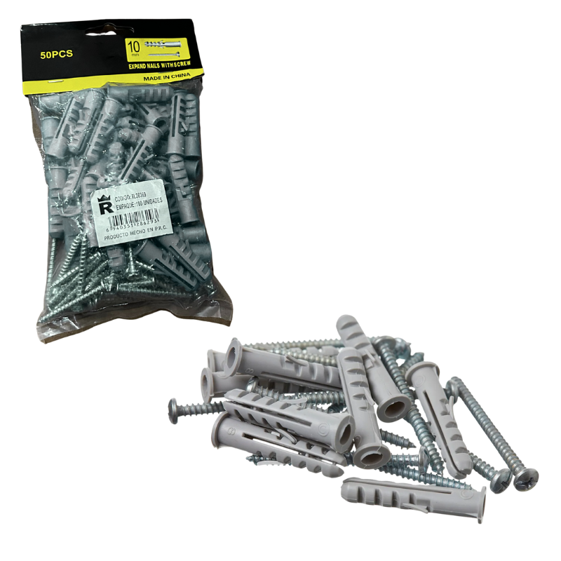 Es un dispositivo de sujeción utilizado para fijar objetos a superficies sólidas, como paredes de concreto, madera o metal. Consiste en un tarugo, que es una pieza cilíndrica generalmente de plástico, metal o madera, que se inserta en un agujero perforado en la superficie donde se va a fijar el objeto. El tornillo se inserta en el tarugo y se aprieta para asegurar el objeto en su lugar. Este tipo de dispositivo se utiliza comúnmente en trabajos de carpintería, construcción, montaje de muebles y diversas aplicaciones de bricolaje donde se requiere una fijación fuerte y segura. La elección del tamaño del tarugo y del tornillo depende del peso y del tipo de carga que se va a sujetar, así como del tipo de material de la superficie donde se va a instalar. En este caso, el "10 mm" se refiere al diámetro del tornillo y del tarugo, lo que indica que ambos son de 10 mm de grosor.