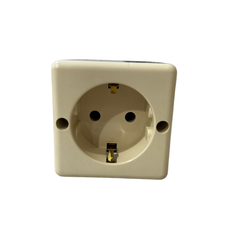 Se caracteriza por tener dos o tres clavijas redondas y un orificio para una toma de tierra en la parte inferior.